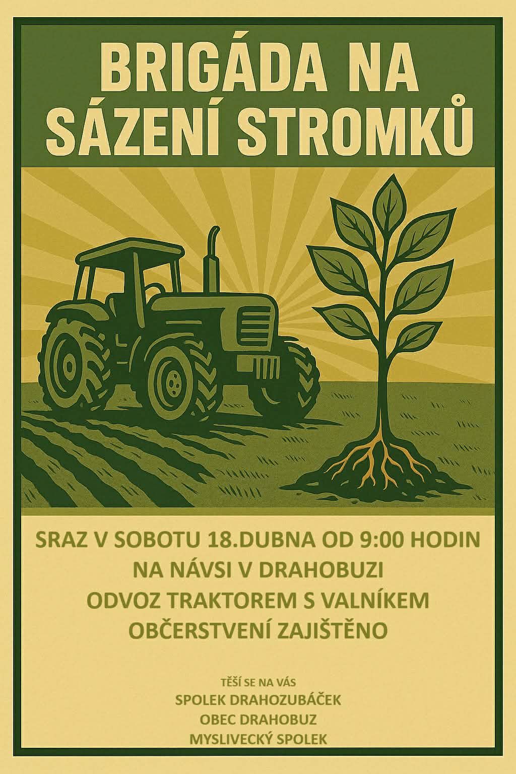 Brigáda na sázení stromků a na opravu poničených stromků od zvěře. Za pomocí Mysliveckého spolku a občanů bychom chtěli obnovit poničenou ovocnou alej ve směru od Drahobuz do obce Strážiště.